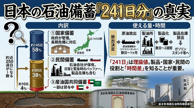 2026年3月20日時点で、日本の石油備蓄は合計241日分とされています。